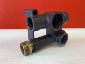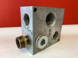 Bilderna visar ett vätskeblock i aluminium för en maskin där en ersättningsdel designats i